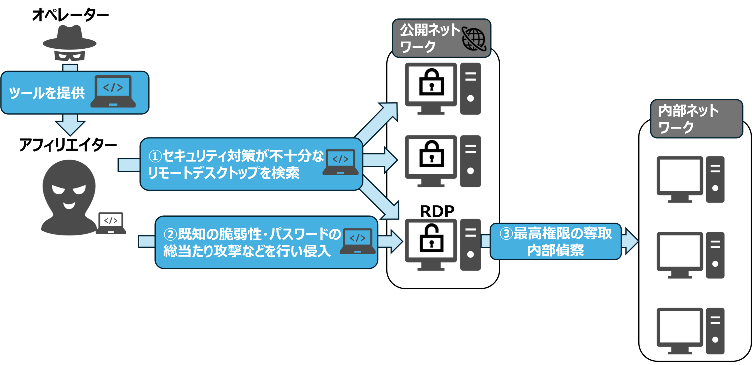 攻撃者はスキャンツールを使用して、インターネット上に公開されているセキュリティ対策が不十分なリモートデスクトップを検索します。
