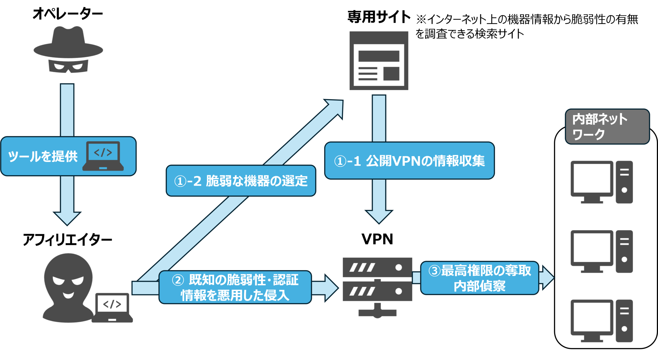 ※2:攻撃に必要なツール、インフラの開発・運営を行いアフィリエイトにツールの貸与などを行う(サービスの提供側)