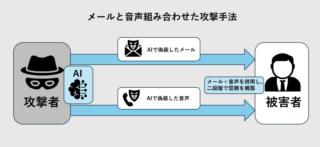 複数のコミュニケーション手段を段階的に使い分ける手法です。事前にメールやチャットで関係性を構築した後に音声連絡を行うなど、信頼度を高めたうえで最終的な不正行為を実行させる特徴があります。