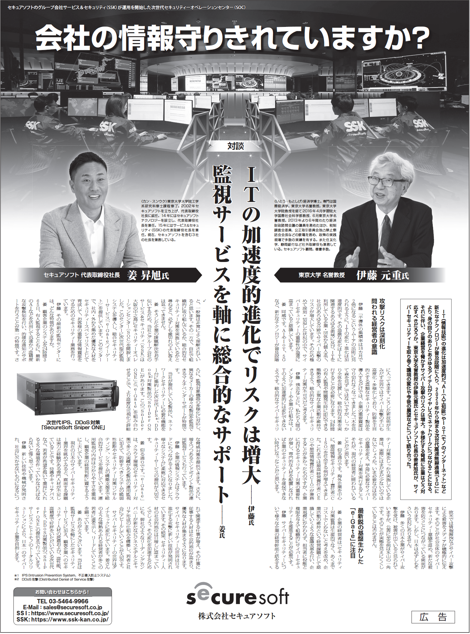 本日(2019年3月22日)日本経済新聞朝刊4面に、東京大学名誉教授 伊藤元重様と弊社代表取締役社長 姜昇旭((株)セキュアソフト兼務)が、「会社の情報守りきれていますか?」と題して対談をした記事が弊社グループ会社(株)セキュアソフトから掲載されました。 是非ご覧いただきますようお願いいたします。